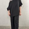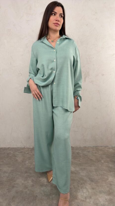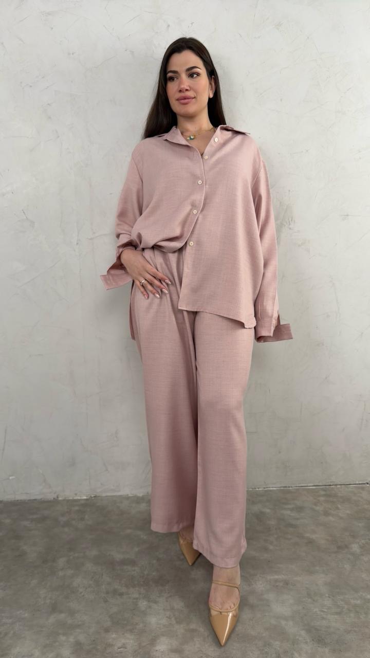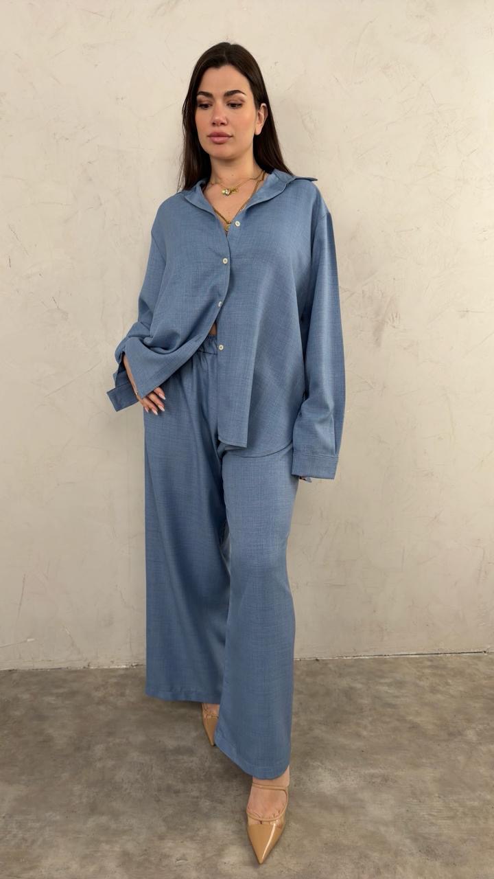 Σετ δύο τεμαχίων αποτελείται από παντελόνι σε φαρδιά γραμμή με λάστιχο στη μέση και πουκαμισο σε ανετη γραμμή
