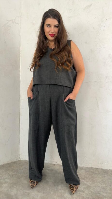 Άνετη και στυλάτη, αυτή η ολόσωμη φόρμα διαθέτει φερμουάρ στην πλάτη και μεγάλες τσέπες μπροστά, ιδανική για casual εμφανίσεις με χαρακτήρα.