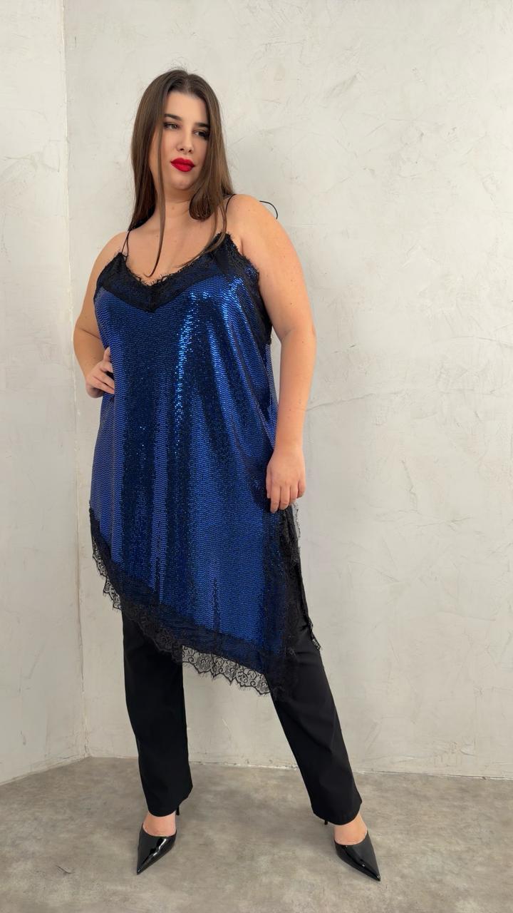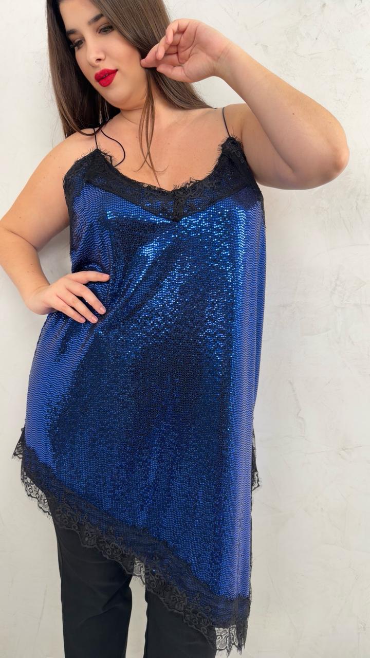 Μπλούζα με ψηλή τιράντα και εκλεπτυσμένες λεπτομέρειες από δαντέλα, σε ύφασμα που λαμπυρίζει με κολλητές παγιέτες.